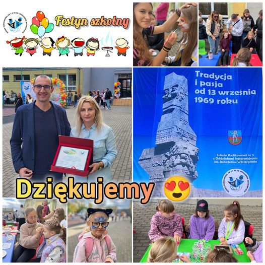 RSSFestyn szkolny odbył się w sobotę w dniu 28.09.2024. Przygotowano dużo różnych atrakcji między innymi: malowanie twarzy i paznokci, tworzenie bransoletek, eksperymenty fizyczno-chemiczne. Odbyła się loteria fantowa oraz sprzedaż ciast, kiełbasek i grochówki. Ponadto była możliwość skorzystania z porad psychologa. Dochód ze sprzedaży przeznaczono na szczytny cel: pomoc dla SP nr 9 poszkodowanej w czasie powodzi. Podczas festynu przewodniczący Rady Rodziców pan Łukasz Bienias wręczył pani Dyrektor Wiolecie Bukowskiej pamiątkową tablicę z okazji Jubileuszu 55-lecia naszej szkoły. Celem festynu była integracja społeczności szkolnej poprzez zabawę i wspólne spędzanie wolnego czasu.